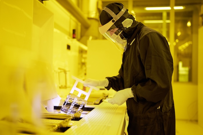 Foto: JENOPTIK AG, © Anna Schroll, Motiv: Mitarbeiter in der Reinraum-Fertigung in der neuen Hightech-Fab von Jenoptik in Dresden.)